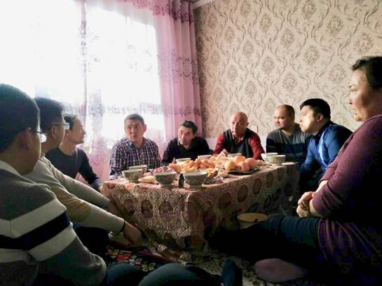 行署秘书长赛肯?卡德尔斯孜在亲戚别尔克哈孜家中共同学习十九大精神,唠家常,共进午餐